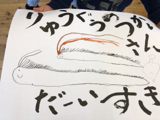 大好きなお父さんお母さん、おじいちゃん、おばあちゃん、学校のクラスのみんな、そしてサンタさん、深海にすむ竜宮のつかいさんに、それぞれの思いや感謝を絵と文字に心を込めて描きました。こんな心のこもった素晴らしい絵手紙をもらったら泣いちゃいますよね。 | |||
