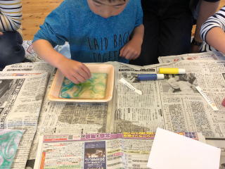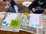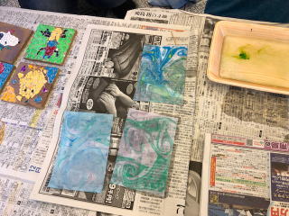 10cm×10cmの板にいろいろな色を塗った卵の殻を使ってモザイクアートに挑戦しました。 殻を小さく割ってピンセットで丁寧にはったり、配色をどうしようかと迷って友達に相談したりあっという間の2時間でした。就学前の子どもたちの集中力は目を見張るものがあります。目が真剣そのものですごく楽しそうにはってました。完成したらピューとお外へ遊びに行きましたが(笑) |