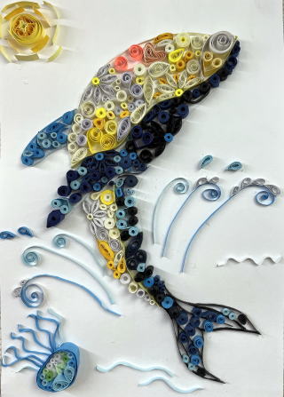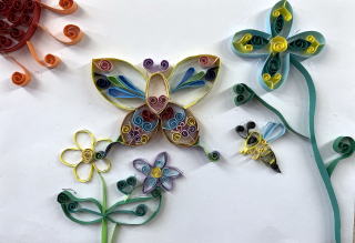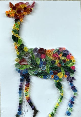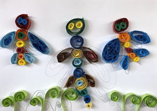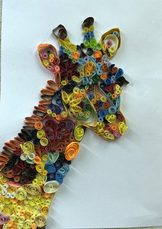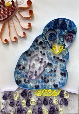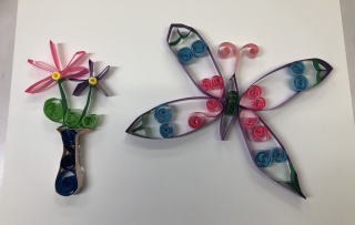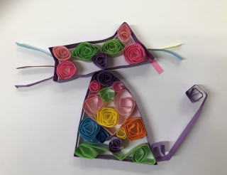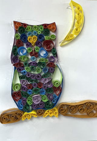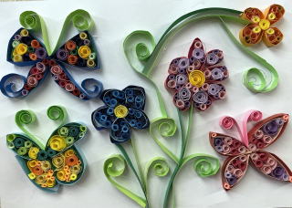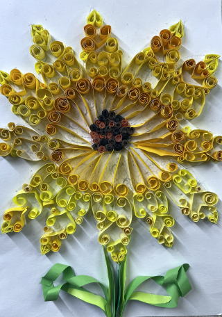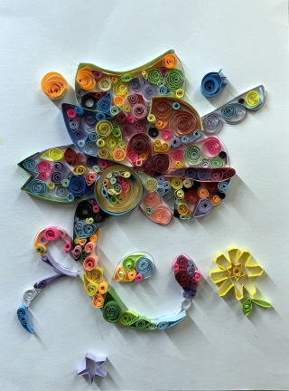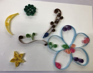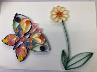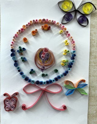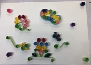 細長く切った色画用紙をくるくる丸め台紙に貼り付けて作品を作りました。