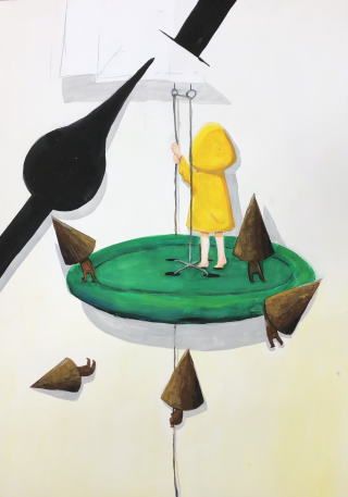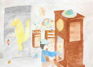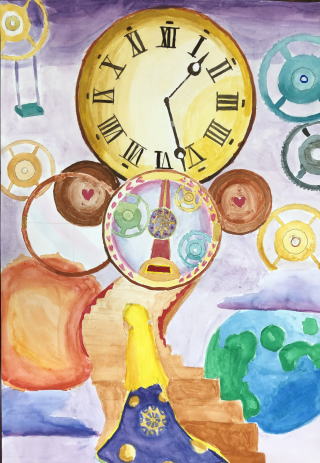 時計をメインのモチーフとし、心象風景を絵に描きました。(中学生対象)