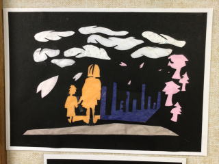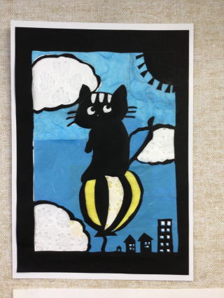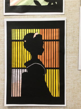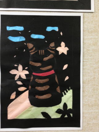 黒い紙を、切りだし刀で切り取って作品を作りました。白黒の作品では少し寂しいので、色紙を貼って華やかさを醸し出してみました。