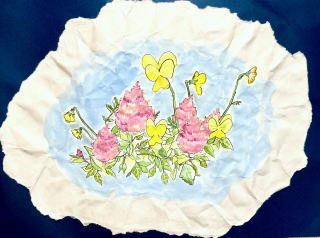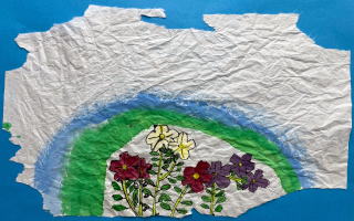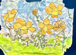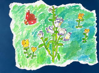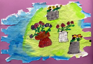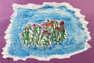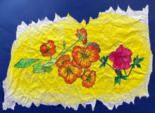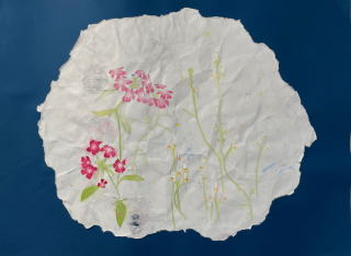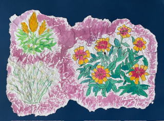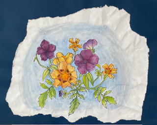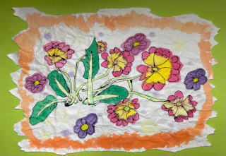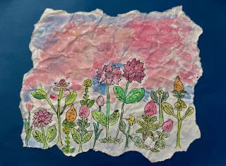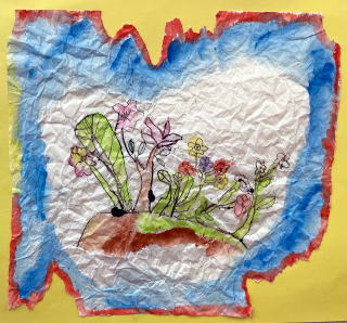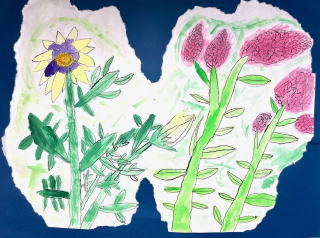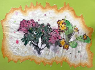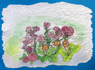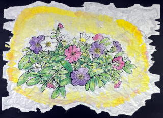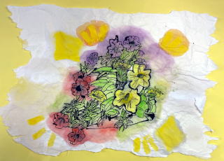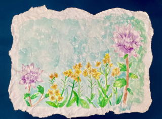 春です、たくさんの花たちが私たちの目を楽しませてくれます。 今回は、春の花を和紙に描くことにしました。 まず紙の用意。四角の紙をくしゃくしゃにしてしわを付けます。そして、周りを破って好きな形にします。これで紙の完成。 各自花を選び、鉛筆で下絵を描き、次に割りばしペンを使って墨で鉛筆の線をなぞり、水彩絵の具で着色。和紙なので絵具のにじみを利用しながら描きました。 最後に、それぞれが描いた絵に合う色の台紙に貼って完成です。 教室に展示すると、観る人の目を楽しませてくれるだけでなく、春の香りも届けてくれるように感じました。 |