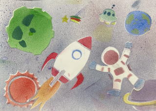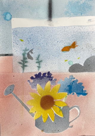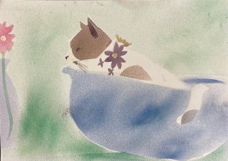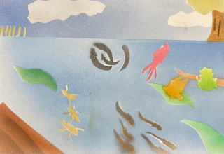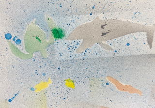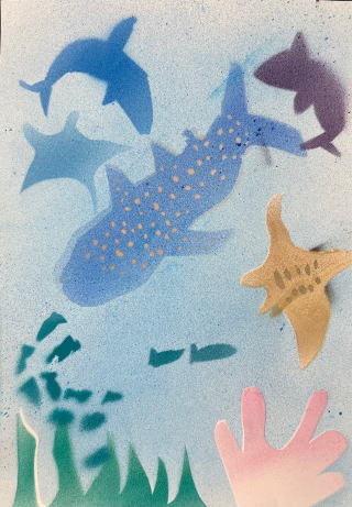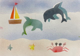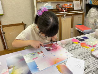 歯ブラシにえのぐをしみこませ、金網の上をシャカシャカこすると霧状になったえのぐが紙の上につき、淡~い色合いの作品ができます。その技法を『スパッタリング』といいます。 今回はその技法のみで一つの作品を作ることにしました。 網は、画材屋さんで調達すればいいのですが、けっこうな値がするので、100均で買ってきた、てんぷらの天かすをすくう網を使いました。(日常使う道具で作品を作れるというのがいいですからね) 子どもたちは、こういった技法を使うのが大好き。でも、うまく霧状になってくれません。 悪戦苦闘しながらも、少しずつ自分の作品が創造しようと思う作品に近づいてくると、自然と顔がほころんでいました。 |