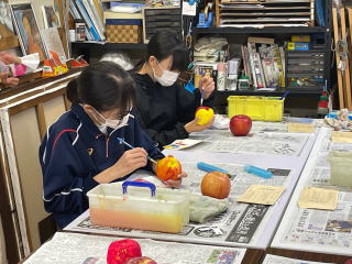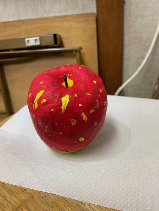 りんごの形や色などをよーく観察して、粘土で形を作っていきます。乾燥させた後、アクリル絵具で色をつけていきます