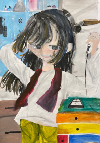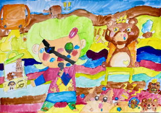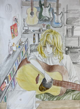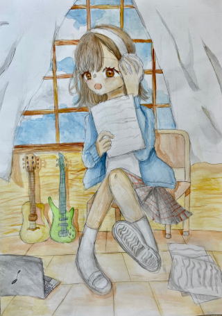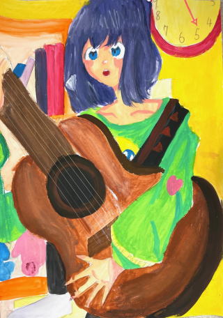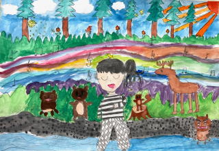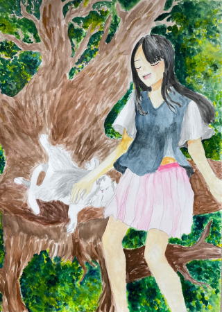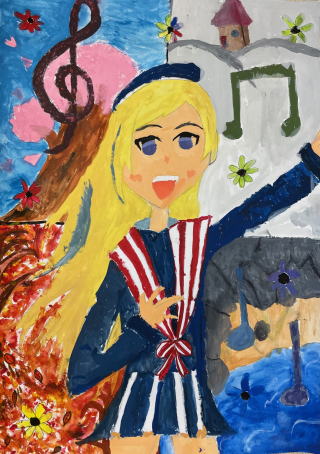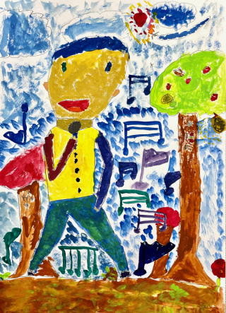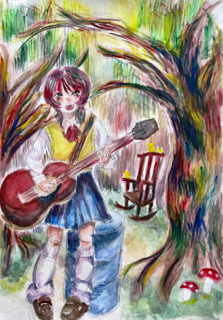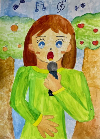 「歌う」をテーマに絵を描きました。歌うのは人だけじゃなく、鳥たちや動物たちも音を奏でたり、さえずったりして周りの者たちを楽しませているでしょう。