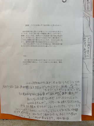 ある物語の序章を読み、あとに続く話を創作する。その話を6コマにまとめて絵コンテで表現する。