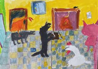 京都新聞社が毎年おこなっている「お話を絵にするコンクール」に参加させってもらっています。学年ごとに数冊の課題図書が決まっており、面白そう、楽しそう、読んでみたいと思う物語の一場面を絵にするというものです。 子ども達は何度も何度も読み返し、想像を膨らませながら熱心に描いています。 ここで紹介するのは2023年度からの作品になります。 入選や佳作などの賞に選ばれる作品もあります。 |