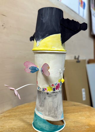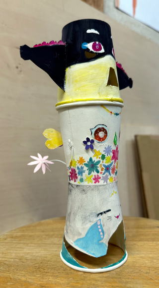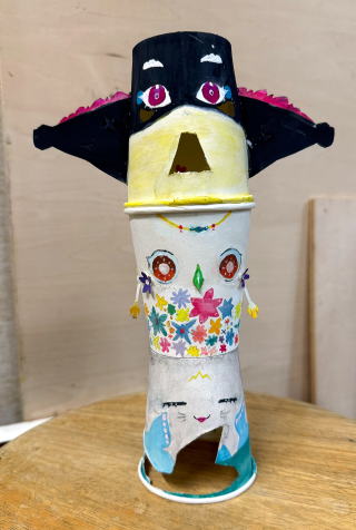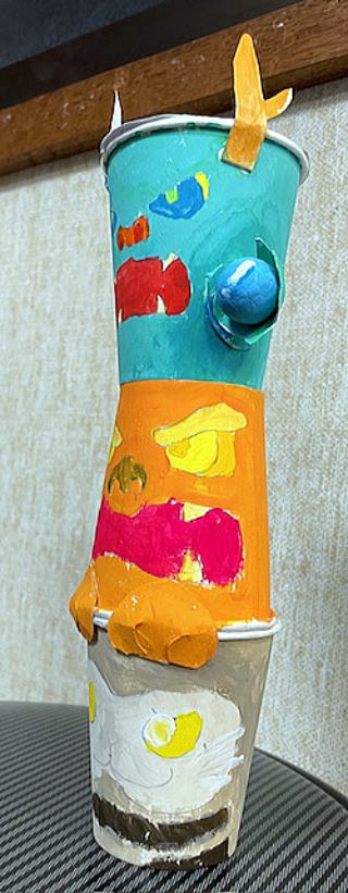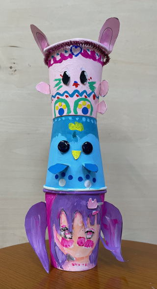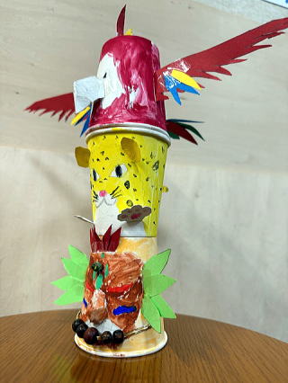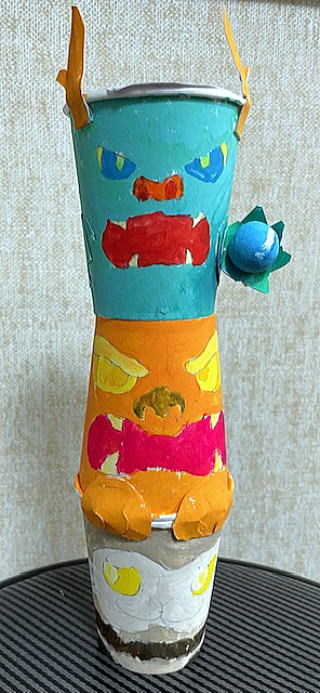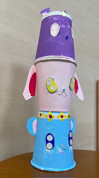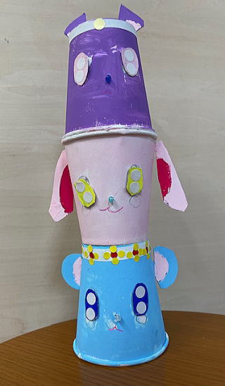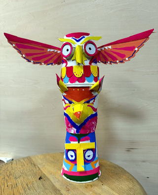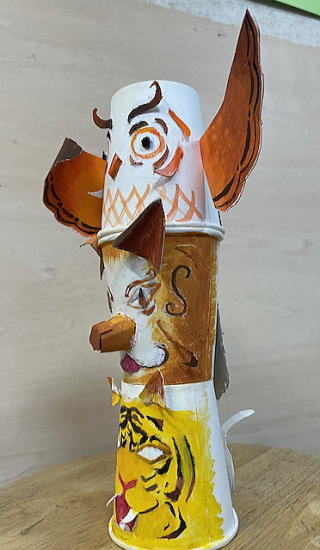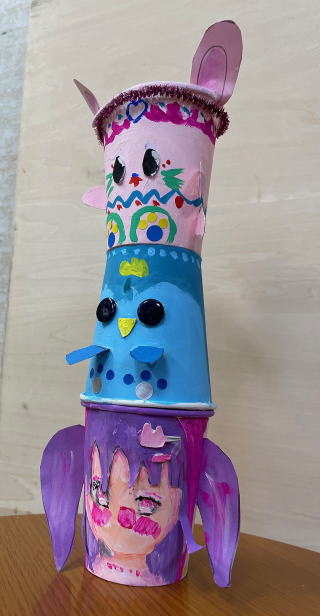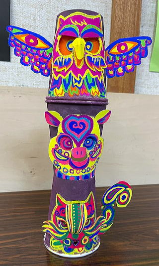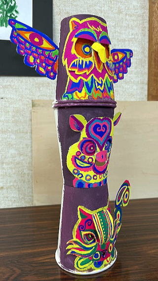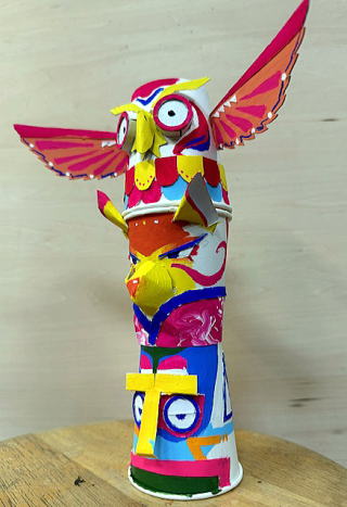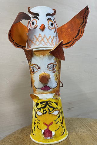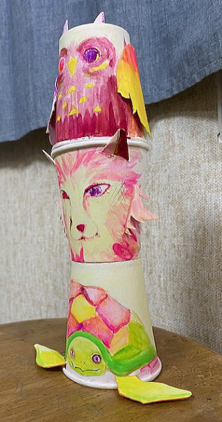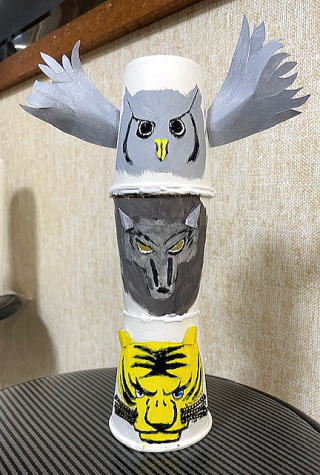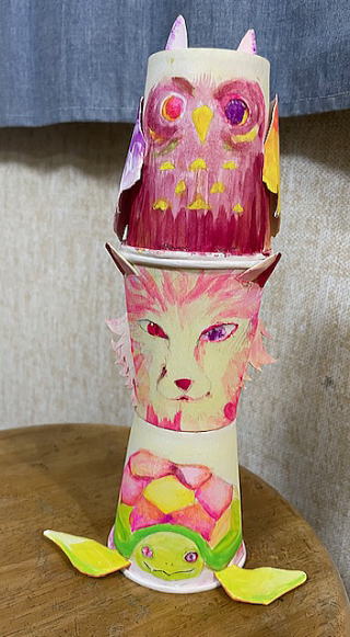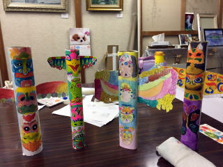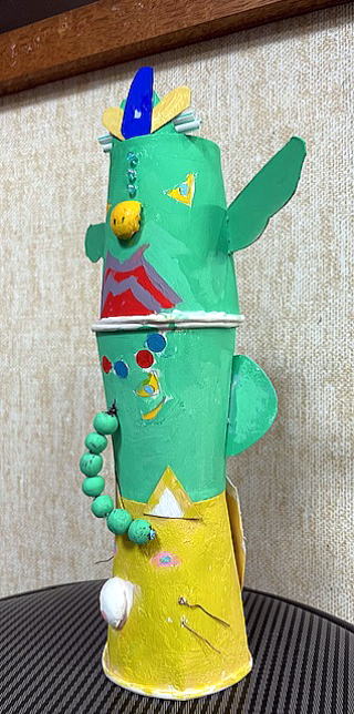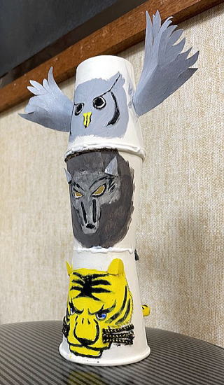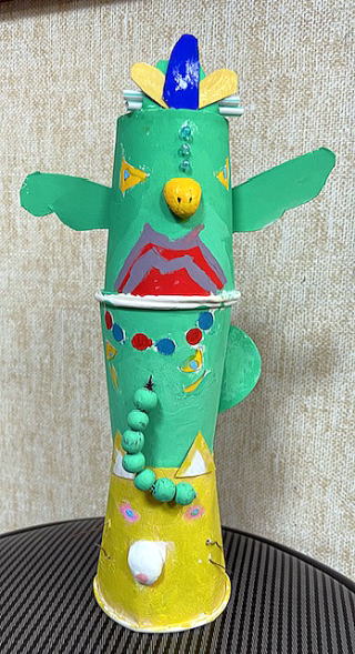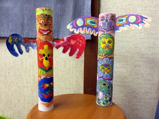北米に住む先住民たちが、村の入り口や家の中、家の前などに立てていた木造彫刻のトーテムポール。 彫刻には動物や鳥、人間などを施し、その家族の歴史や物語を伝える役割があるといわれている。 そんなトーテンポールを、ラップなどの芯や紙コップを使って作ってみた。 ラップの芯は硬いので、貼り付けることはできるものの、切りこみを入れることができず、絵具で描くだけであった。 紙コップは柔らかいため、描くことはもちろん切ったり、貼ったり立体的に表現することができるので、子どもたちはその特性を生かし、各々工夫を凝らし、制作に熱中していた。 |